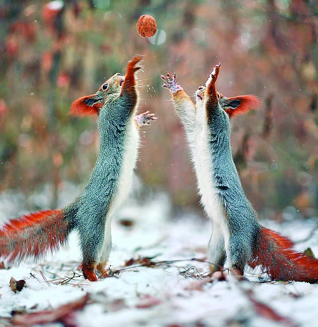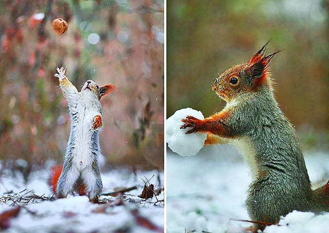 কিন্তু আসল সত্যটা একটু ভিন্ন—তখন শীতকাল, তুষারে ঢাকা চারপাশটায় খাবারের সংকট। এই কাঠবিড়ালিগুলোও ছিল তখন খিদের জ্বালায় অস্থির, তাদের খাবারের দরকার। আর তাই তো হাতের কাছে যা পেয়েছে, পাইন ফলের বীজ আর বাদাম নিয়ে যুদ্ধে মেতেছে এরা। কার খাবার কে লুফে নেবে, এই নিয়ে ব্যস্ত ওরা, আর আমরা ভাবছি, খেলছে বুঝি! এমন সব কাণ্ডকারখানা ট্রুনভকে কাছে টেনে নেয় তাদের ছবি তুলতে।